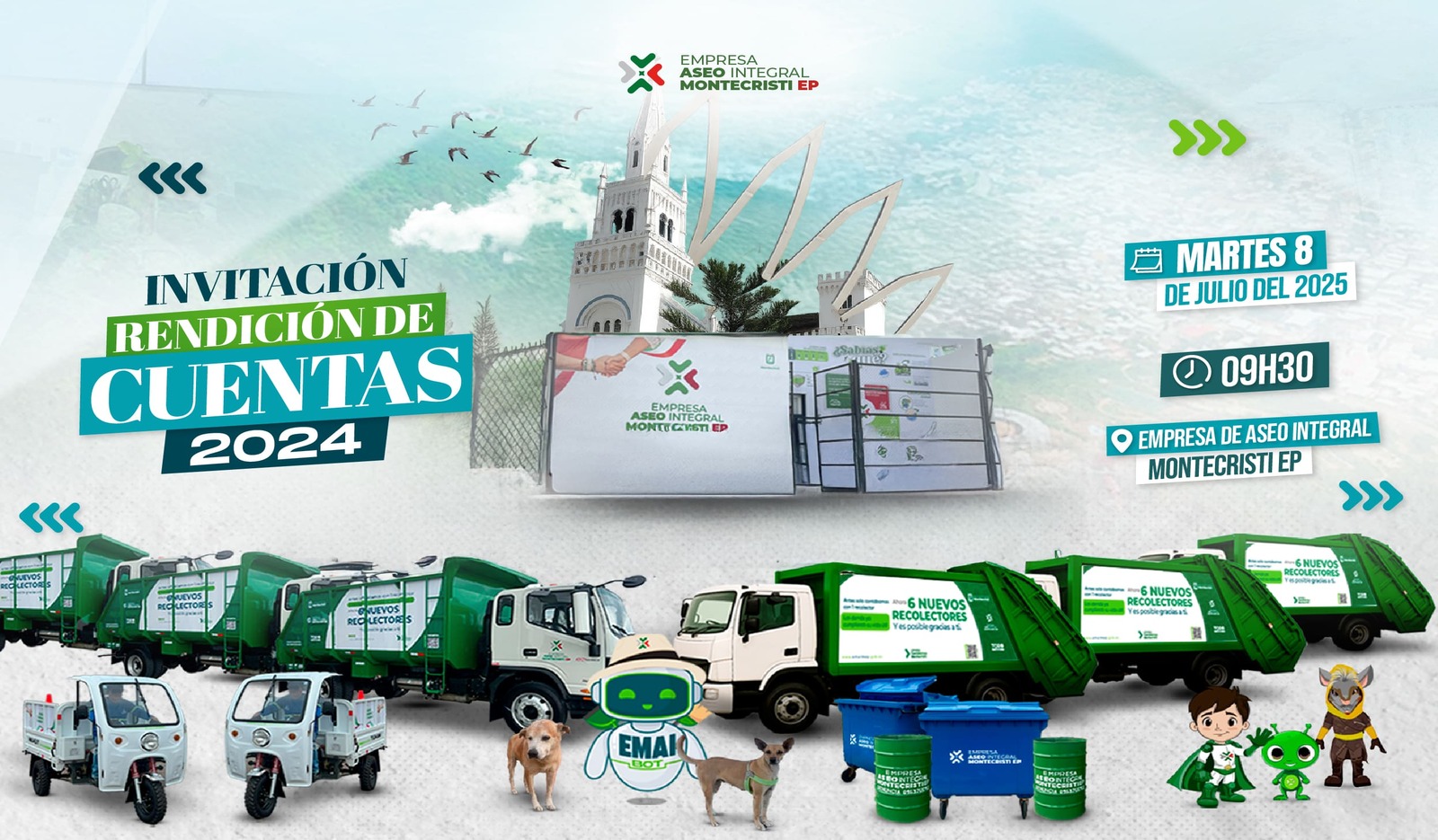 La Empresa Municipal de Aseo Integral Montecristi-EP invita formalmente a la ciudadanía en general a ser parte del Evento de rendición de cuentas del año 2024, mismo que se realizará en las instalaciones de Empresa, ubicadas en la calle Pichincha y Av. Manta. El evento se llevará a cabo el día martes 08 de julio del 2025 a las 09:30 AM.